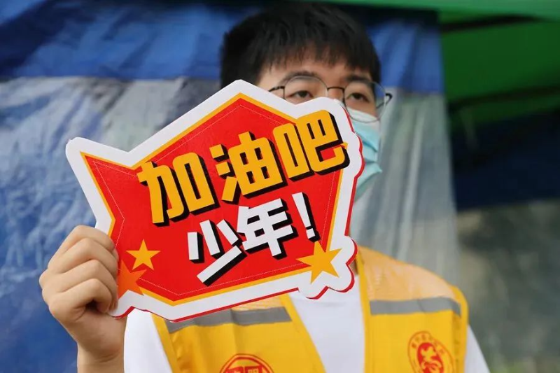 家长、志愿者也花式为考生加油打气。
