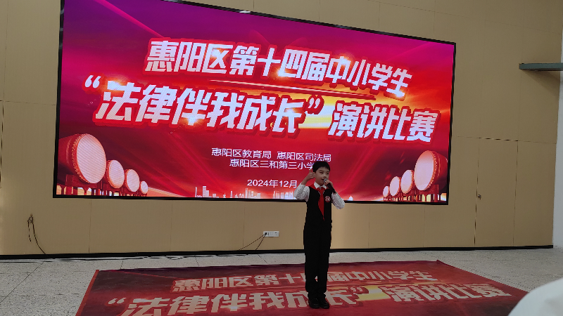 为持续推进青少年法治宣传教育,结合市、区普法工作部署及要求,惠阳区教育局联合区司法局于12月24日在惠阳区三和第三小学,举办了惠阳区第十四届中小学生“法律伴我成长”演讲比赛。