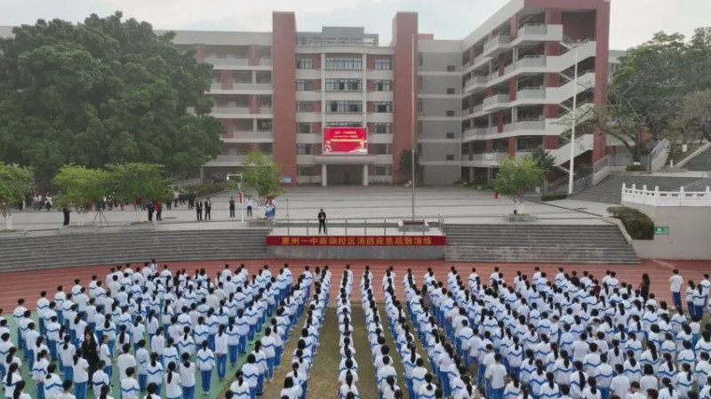 “铃铃铃~着火啦!”20日上午 7:50,惠州市第一中学南湖校区内消防警报响起,各班学生在班主任的带领下,迅速沿着指定路线有序撤离到安全地带,整个疏散演练过程井然有序。