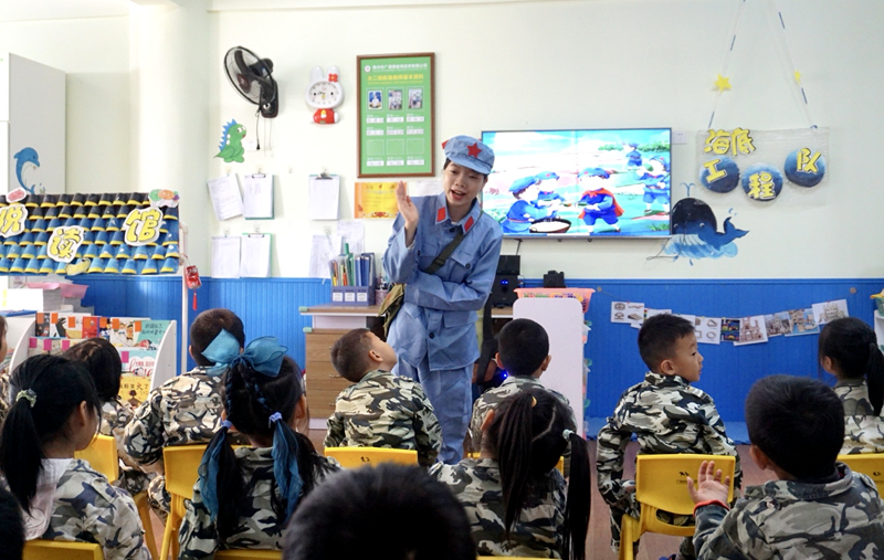 活动中,志愿者小老师以《倔强的小红军》绘本为课程的引入,配合着“红军叔叔”投入的话剧表演,小朋友们聚精会神地听着故事。志愿者小老师通过声情并茂地讲述红军故事,引导孩子们认识自己的使命与责任担当。孩子们被故事里小红军林宇的奉献精神深深感染着。